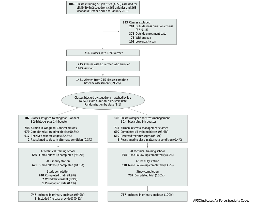 Additional Contributions: Mark LoMurray, BA (Sources of Strength, Inc), consulted on training process and content, and Timothy McGowan, MA (private contractor), worked as a Wingman-Connect trainer; they both received compensation for their activities. Chelsey Hartley, PhD (University of Rochester), provided training support, and Ian Cero, PhD (University of Rochester), provided comments on the analysis and manuscript; they were not compensated for their activities. We are also grateful for study support from Jessica Ditson, MSW, Lawrence Brown, BS, and other leaders and training cadre at the Technical Training School, Sheppard Air Force Base (82nd Training Wing).