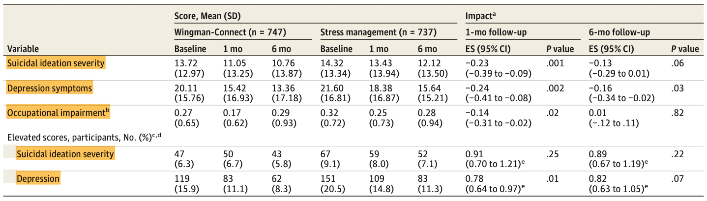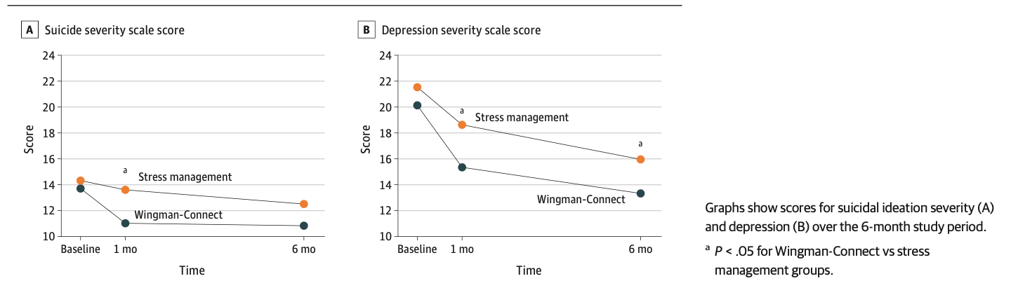 Wingman-Connect Impact on Suicide Severity, Depression, and Occupational Impairment (Primary Outcomes) at 1-Month and 6-Month Follow-up