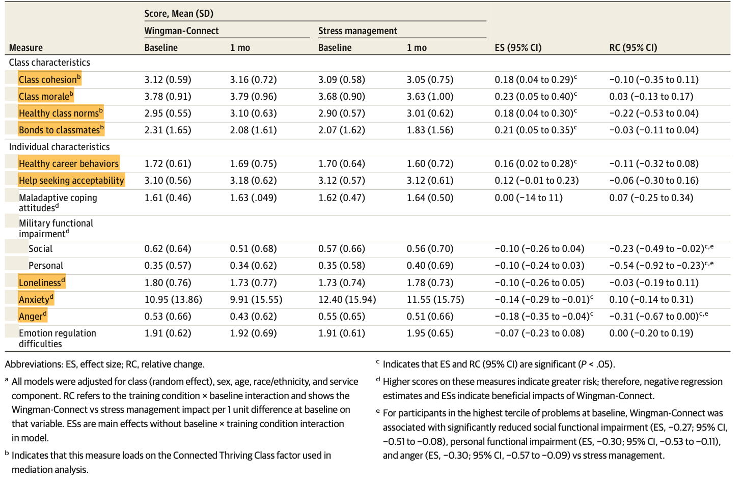 a Negative regression estimates and ESs indicate beneficial Wingman-Connect impact. All models were adjusted for class (random effect) and sex, age, race/ethnicity, and Air Force component.