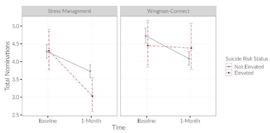 Wingman-Connect counteracted the typical drift towards disconnection for Airmen at elevated suicide risk. Findings from the control condition indicated that the typical trajectory for Airmen with elevated suicide risk was towards decreasing connections and increasing isolation. Specifically, Airmen in the active control condition who were at elevated risk showed a significant decline in total valued connections of 19% compared to Airmen not at risk (RR = 0.81, 95% CI = 0.66, 0.99; P = .047). In contrast, in Wingman-Connect trained groups there was a non-significant trend such that more valued nominations were maintained among at-risk Airmen compared to non-elevated counterparts (RR = 1.14, 95% CI = 0.92, 1.41; P = .23). Fig. 2 shows average total valued connections at baseline and 1-month for Airmen at elevated suicide risk vs. not at risk for active controls (left) and W-CP (right).