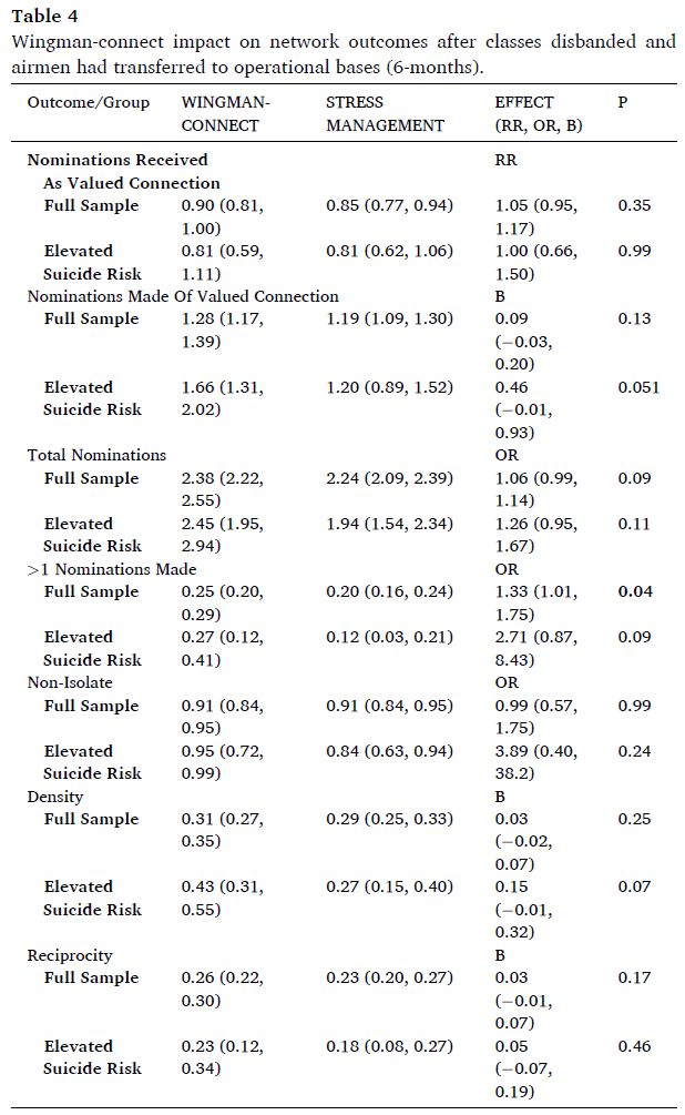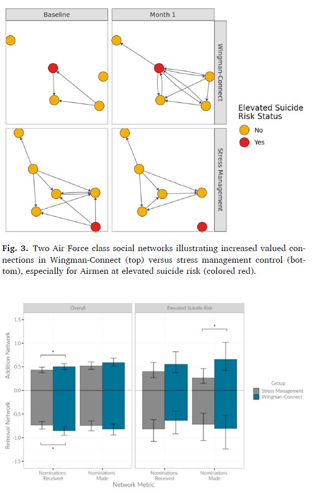 The Wingman-Connect Program (W-CP) improved multiple metrics of social network health for all Airmen, with the greatest benefit for those with elevated suicide risk. For at-risk Airmen, W-CP increased valued connection nominations received from classmates by 53% and eliminated isolation while class units were together in training. These findings are especially notable given that W-CP had no explicit content targeting at-risk Airmen or encouraging Airmen to form connections with at-risk peers. The findings are also notable given the broad deficits – that would likely impact social network formation and evolution – observed in at-risk Airmen at baseline (e.g., higher anger, depression, emotion regulation difficulties). Nevertheless, for at-risk Airmen in WCP classes other airmen were motivated to form close ties with them and increase their integration into their class networks. Moreover, months after classes were disbanded, W-CP’s effect on a key indicator of network integration (i.e., two or more connections with classmates) was still significantly greater than controls. These effects were achieved through 6 h of group training, with periodic reinforcing text messages. These findings are, to our knowledge, the first to show that a suicide prevention program for small personnel units improved significantly the group relationship network and socially integrated members at elevated risk for suicide over time.
