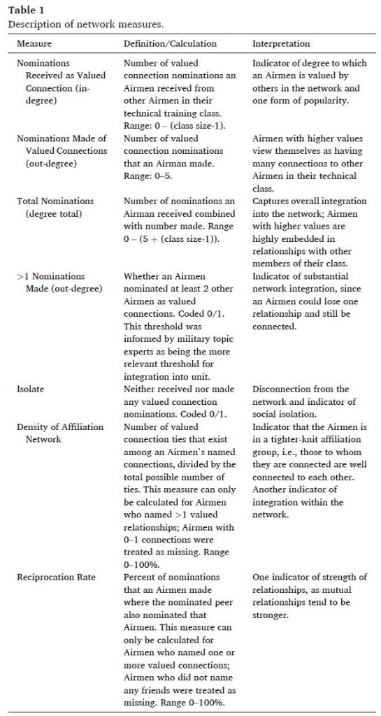 Network Measures. Valued connection nominations from each Airmen (i.e., ego) to other Airmen (i.e., alters) were used to construct social network graphs of each class, on which network metrics were computed. The collection of metrics used in this study is given in Table 1.