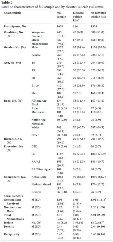 This study’s primary outcomes were indices of social network integration (see below). Previously reported outcomes for this trial included self-report measures of suicide risk, depression and occupational fitness problems (Wyman et al., 2020) This study used suicide scale (CAT-SS) scores of the Computerized Adaptive Test for Mental Health (Gibbons et al., 2017) collected at baseline to identify Airmen at elevated risk for suicide. The CAT-SS administers a statistically optimal subset of items from a bank of 111 items from validated scales syndromally associated with suicidal thoughts and behaviors. Across the range of CAT-SS scores (0–100) there is a 52-fold increase in likelihood of current suicidal ideation validated against clinician assessment on the Columbia Suicide Rating Scale (C-SSRS). CAT-SS also yields categorical scores (low, medium, and high); a 1-category change corresponds to a 16 times greater likelihood of an increase in C-SSRS’s ordinal scale. We combined medium and high categories for this non-clinical sample. Airmen with a suicide scaled score greater than 34 were considered at elevated risk for suicide.