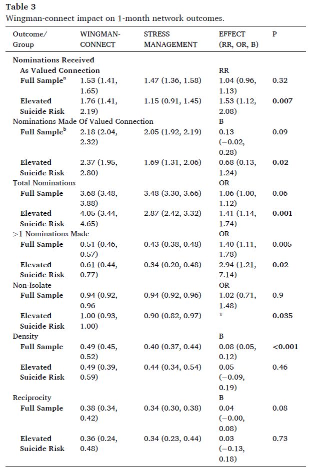 Wingman-Connect increased measures of network integration, with larger and broader impact for Airmen at elevated risk of suicide (see Table 3 for results of primary outcome analyses).