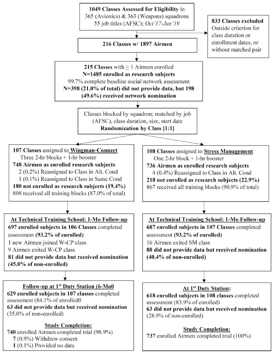 Fig. 1. Flow of randomized technical training classes and the social networks of Airmen embedded within them in the Wingman-Connect Trial.